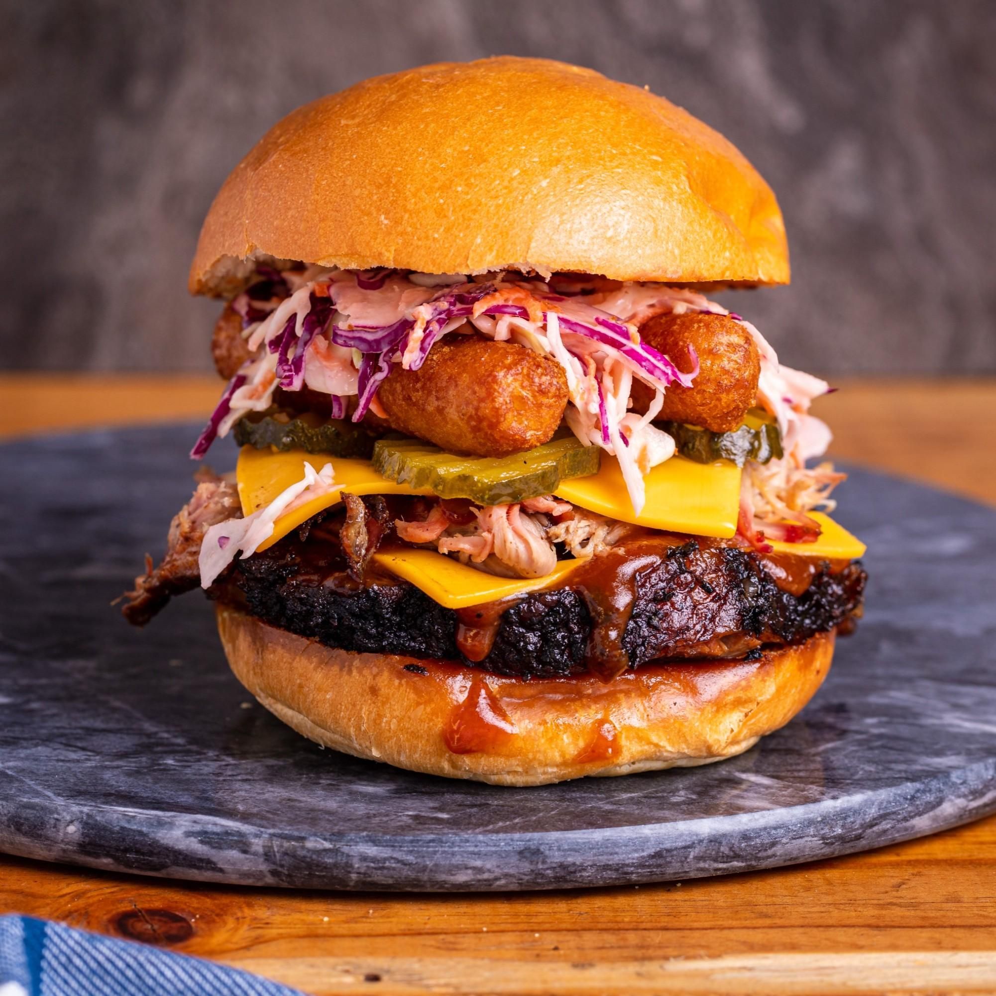 Beef Brisket & Pulled Pork on a soft artisan milk bun with double American cheddar cheese, tangy BBQ sauce, pickles, slaw & 2x Mozzarella Sticks