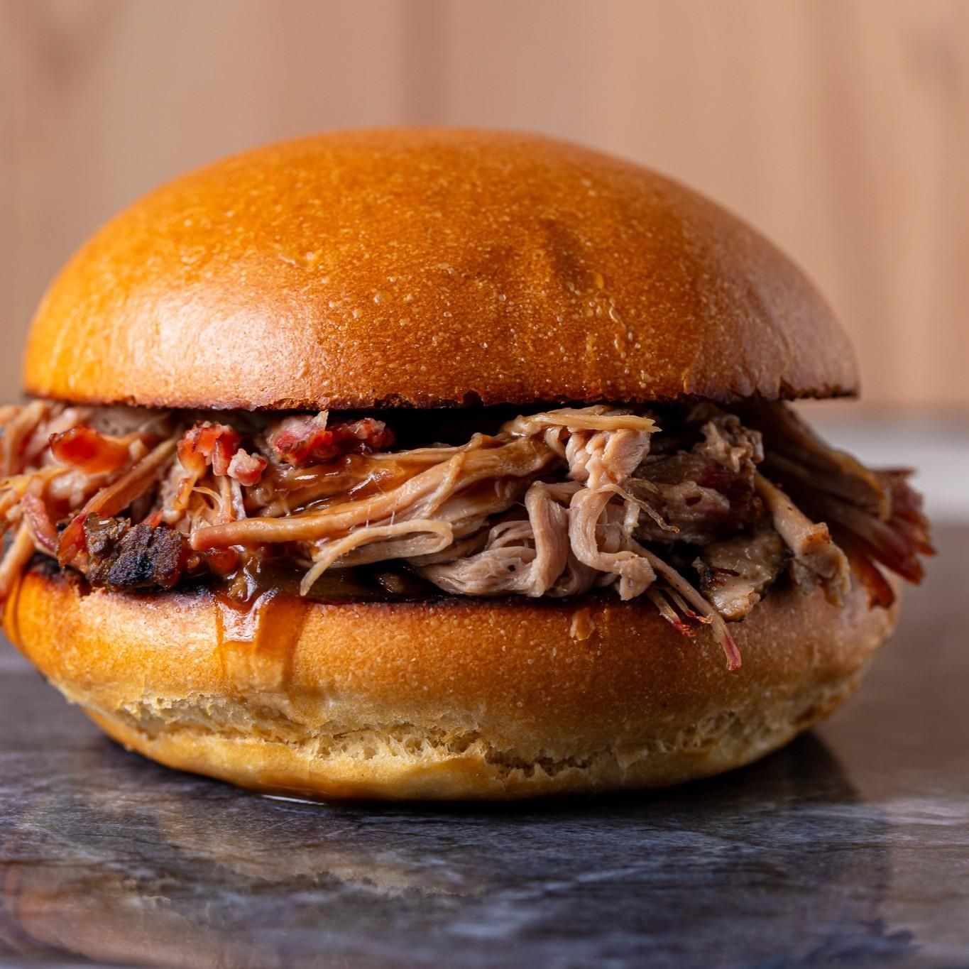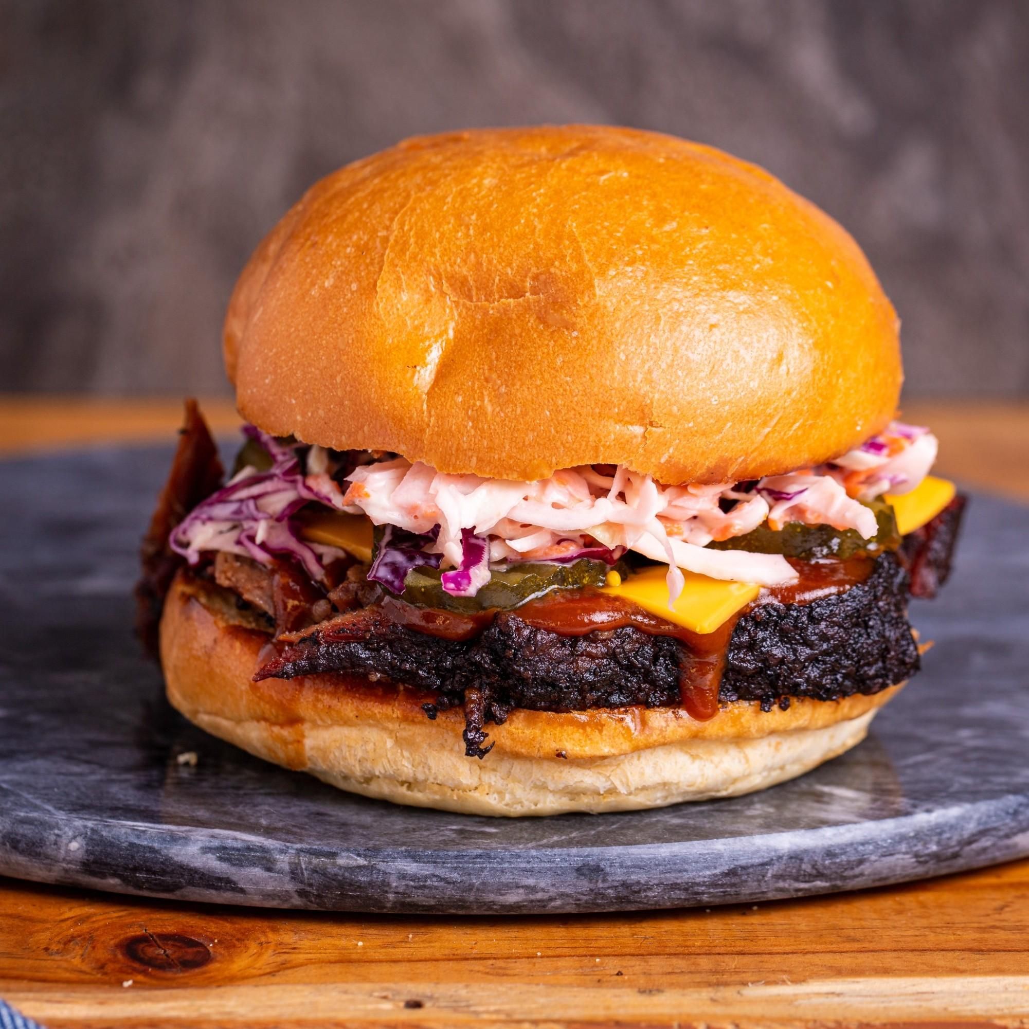 Brisket Smash patty, Melted American Cheese, Bacon, Tangy BBQ Sauce & Mayo on a toasted Milk Bun