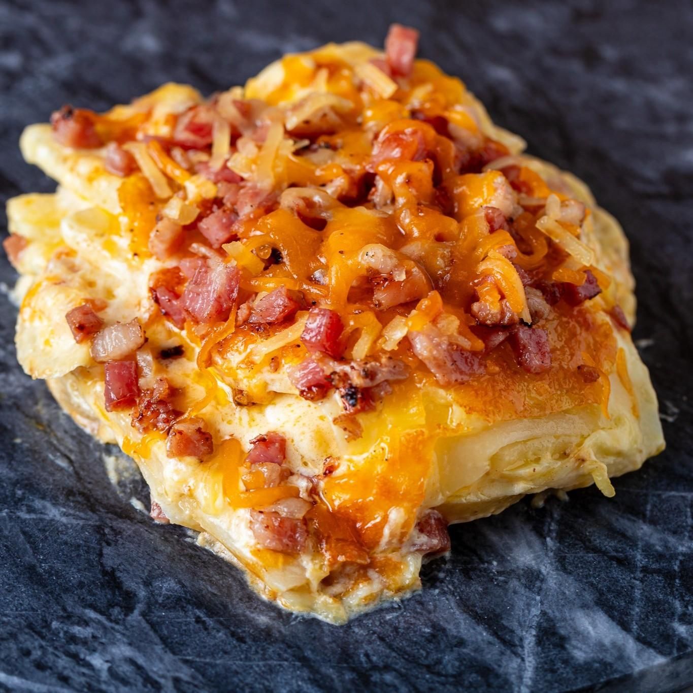 Single Serving of Bacon topped Creamy Garlic Potato Bake.
