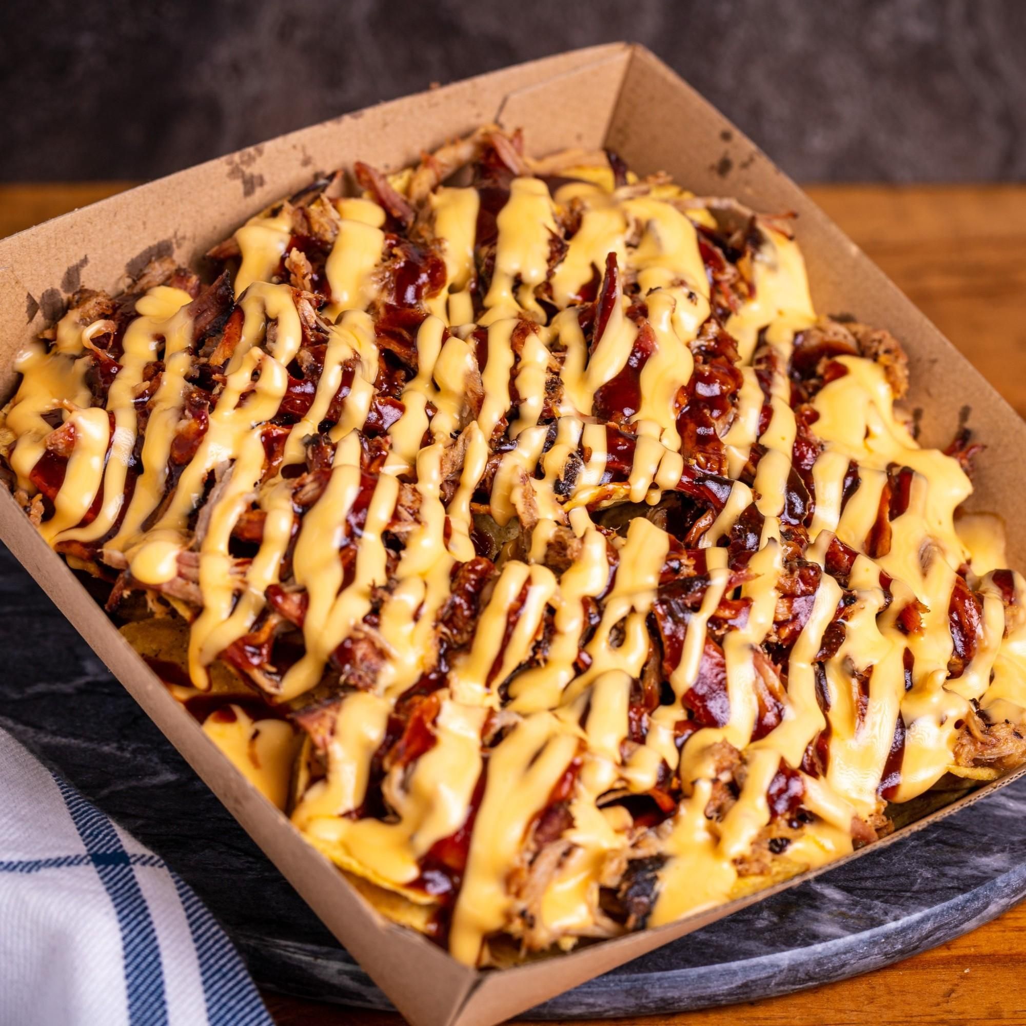 Gluten Free Corn Chips topped with choice of smoked meat, Melted American cheddar cheese & Tangy BBQ Sauce