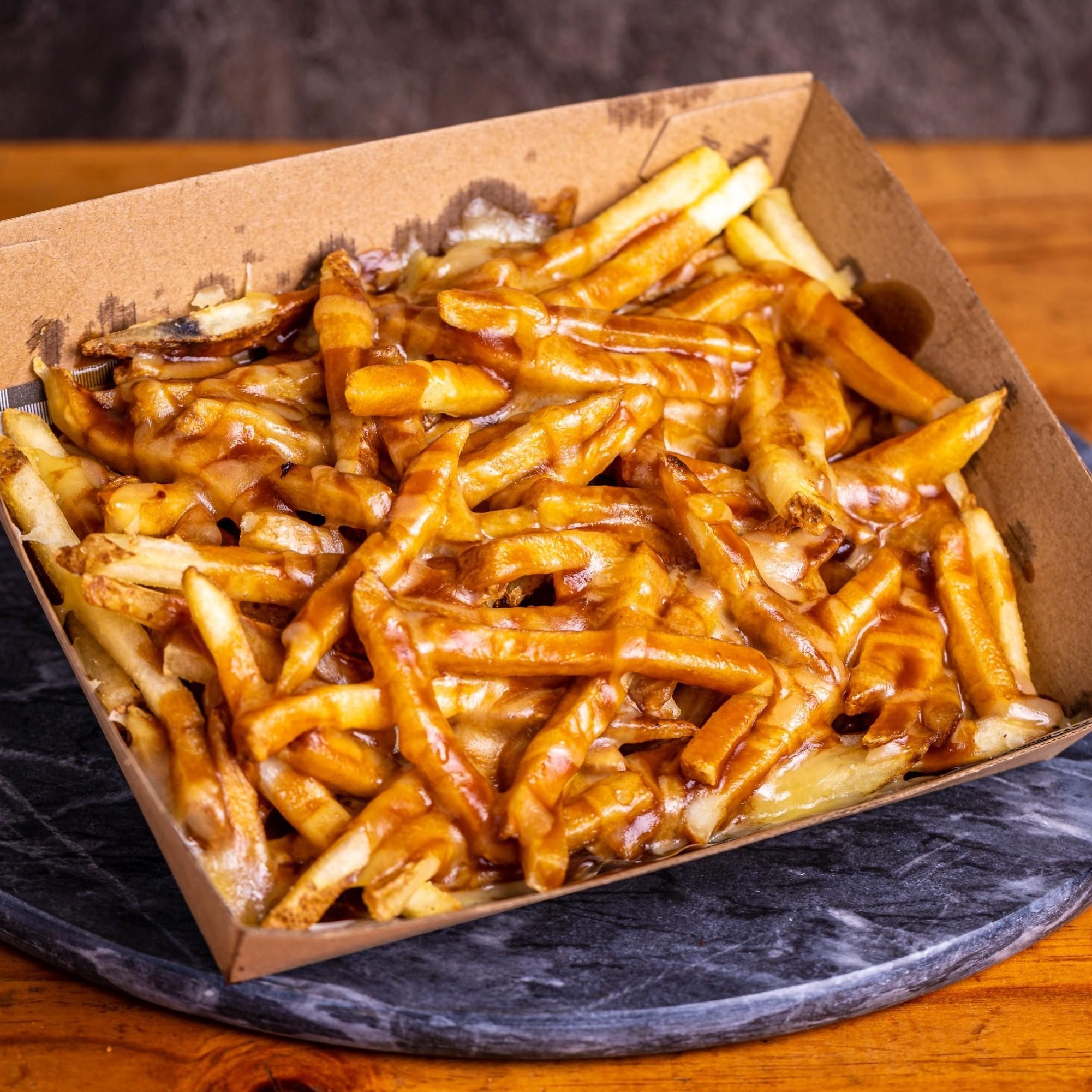 Fries topped with shredded cheese & a rich brown gravy