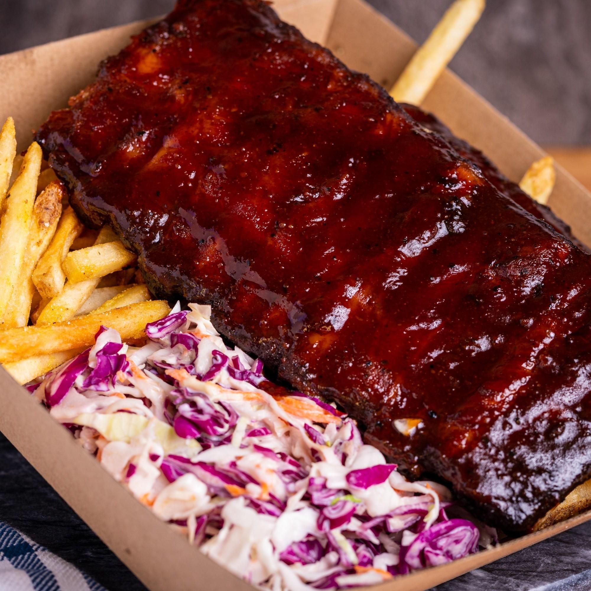 Pork ribs glazed with SBR’s Honey Garlic BBQ Sauce served with fries and slaw