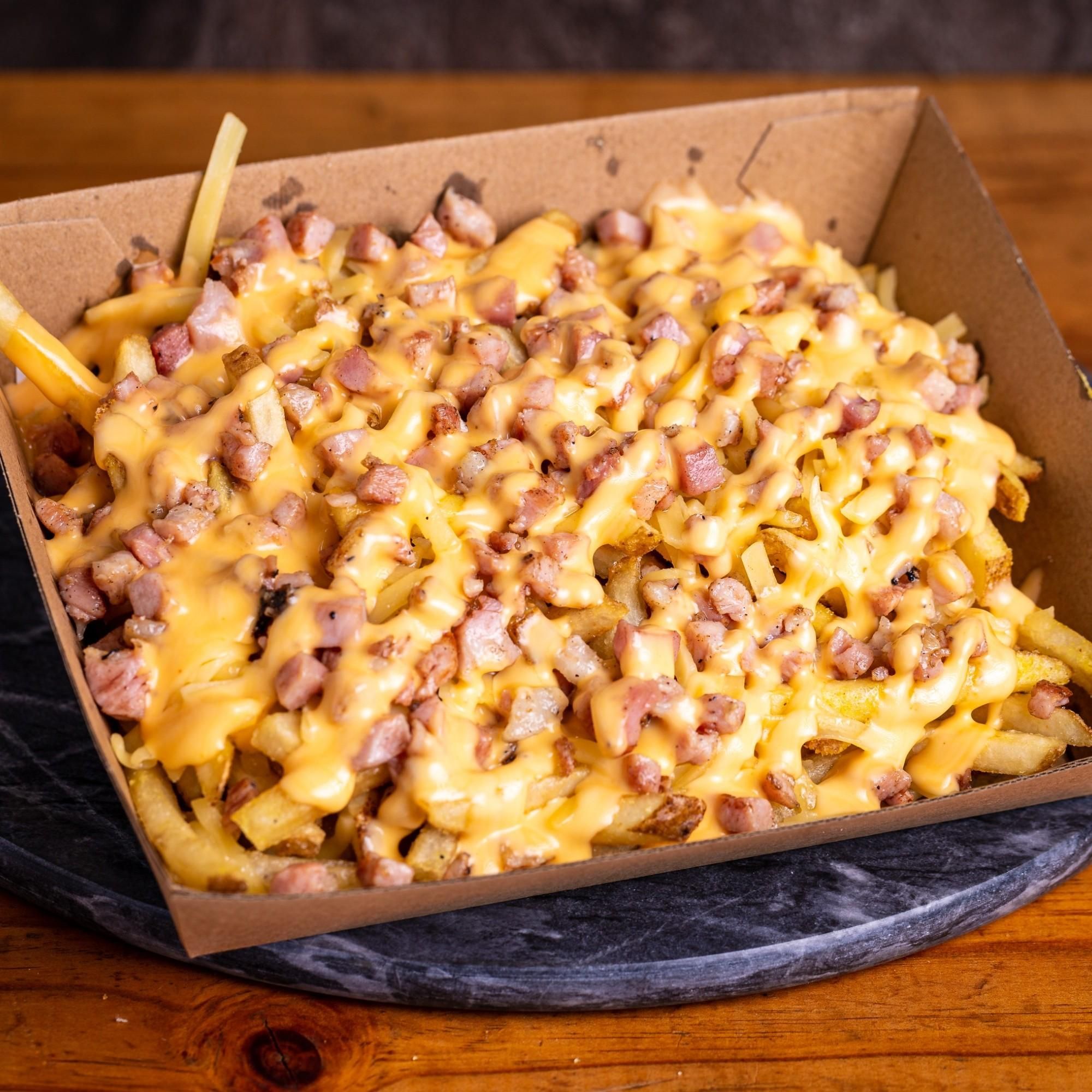 Fries topped with shredded cheese, diced bacon & Melted American cheddar cheese