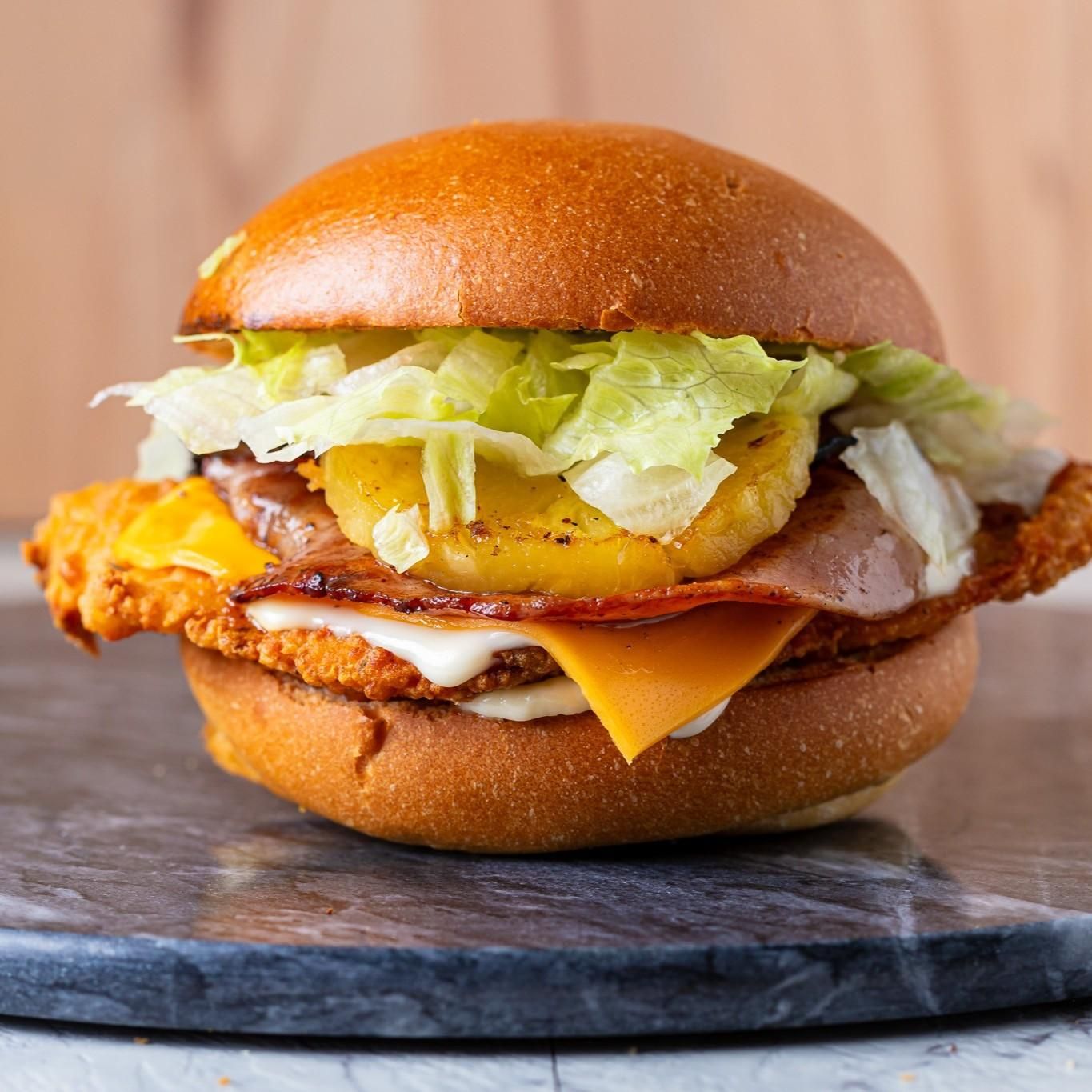 Southern Fried Chicken Breast, Garlic Aioli, American Cheese, Bacon, Lettuce, Mayo & Pineapple on a toasted Milk Bun