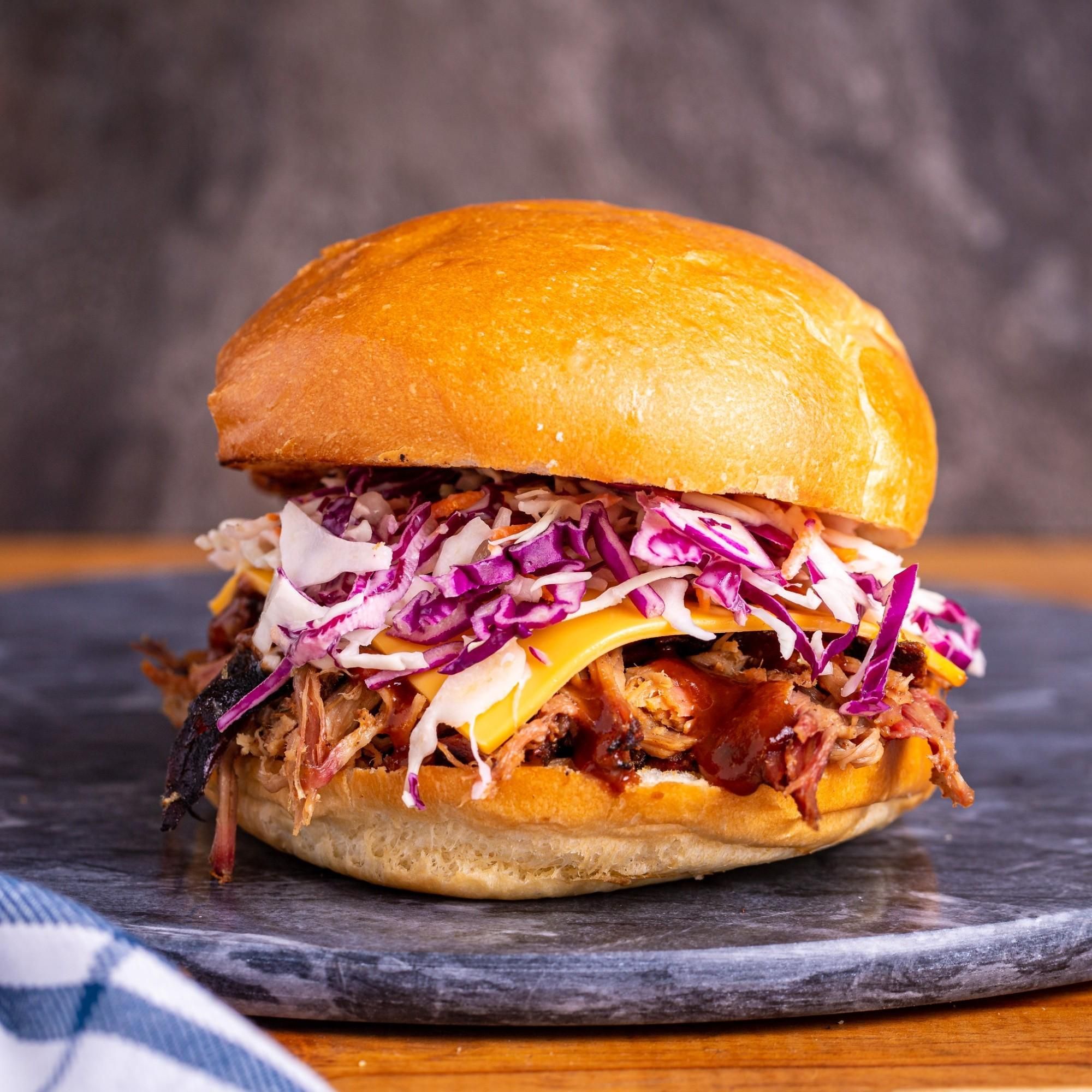 Pulled Pork on a soft artisan milk bun with American cheddar cheese, tangy BBQ sauce & slaw